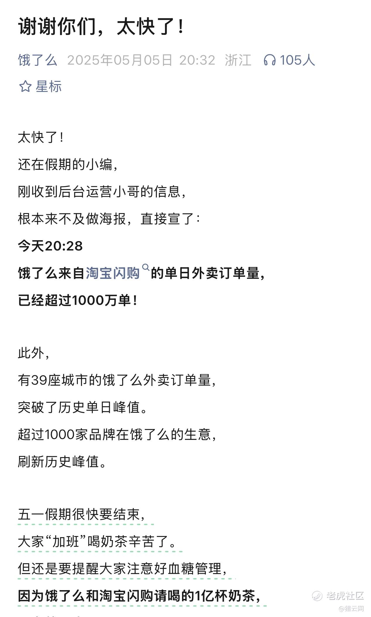 再到5月5日,在饿了么《谢谢你们,太快了》的推文中,饿了么来自淘宝闪购的单日外卖订单量,已经超过1000万单。