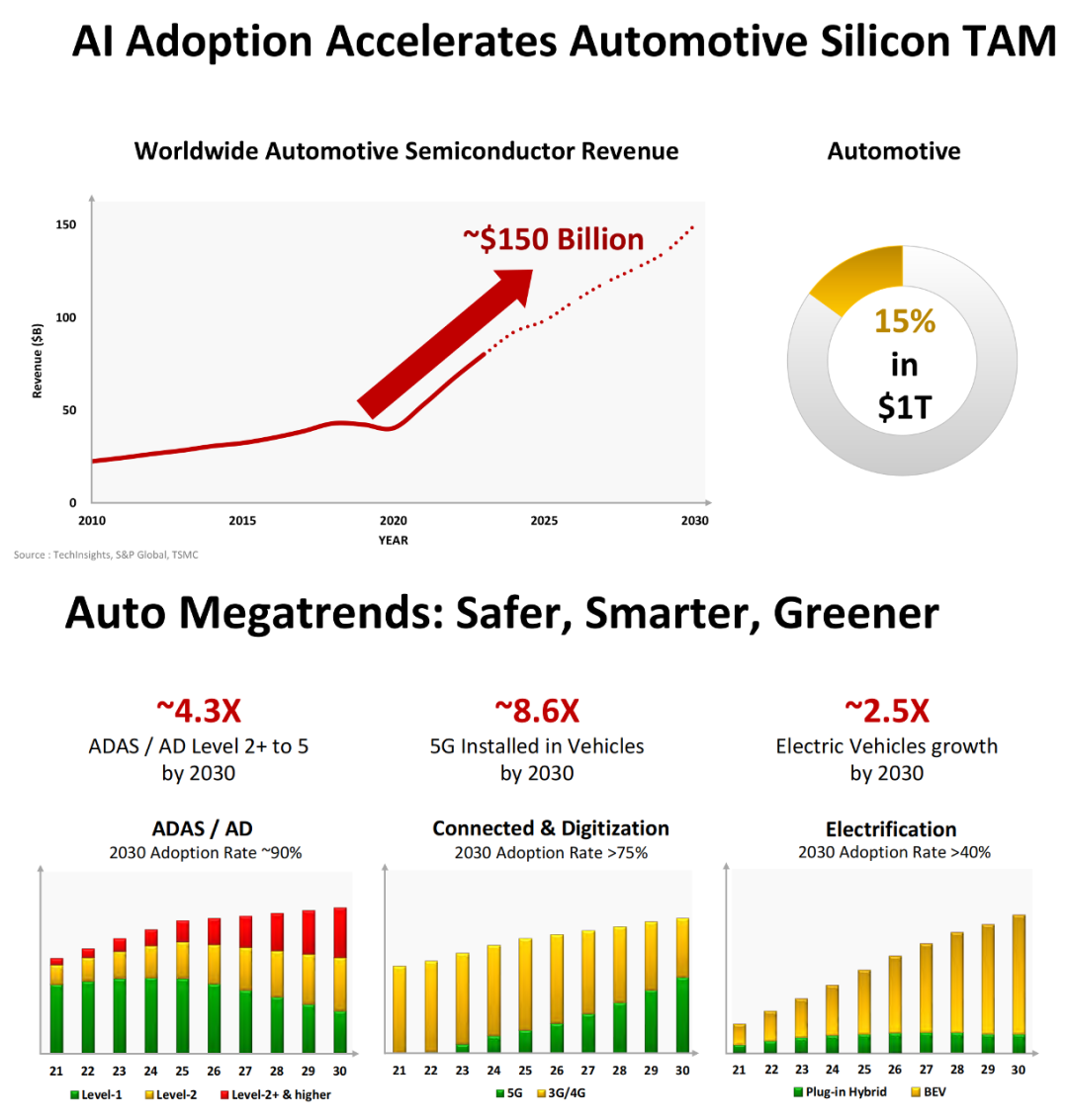 台积电在演讲中给出一个极具说服力的数据:未来五年,AI将推动整个半导体产业规模迈向1万亿美元,其中约15%——也就是1500亿美元——将来自汽车芯片。