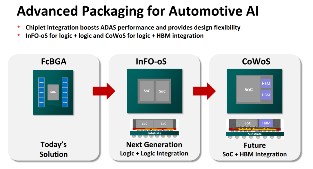 先进封装技术是Chiplet架构落地的核心支撑,台积电为此为汽车AI提供了三大封装方案: