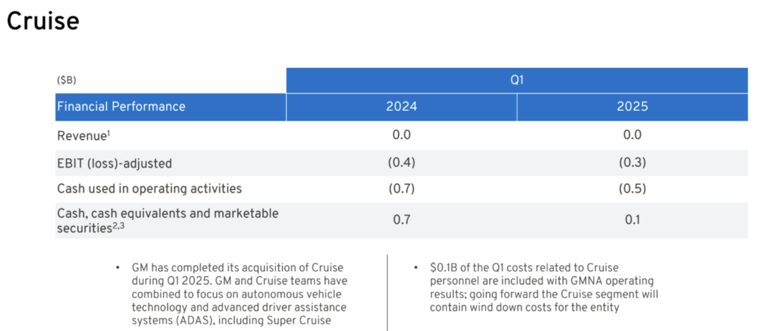 Cruise:息税前亏损(调整后)3亿美元。经营活动现金使用量5亿美元,截至2025年3月31日现金、现金等价物和有价证券:1亿美元。