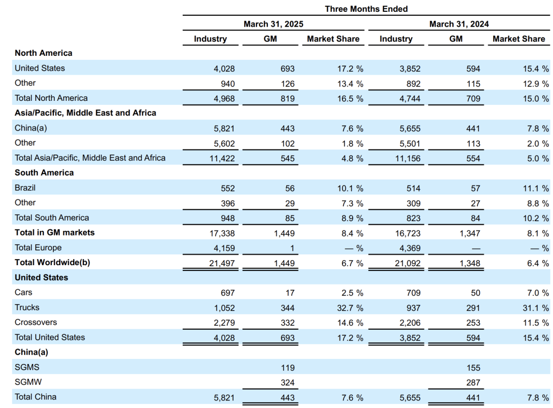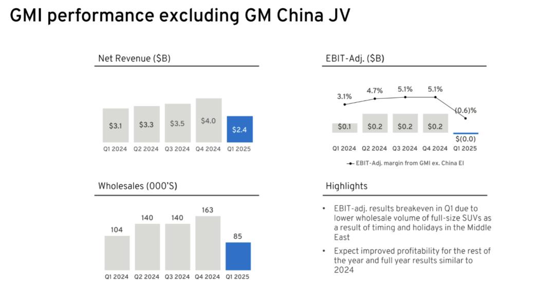 通用汽车国际公司(GMI,不含中国合资企业):2025年第一季度净收入为24亿美元,销量为8.5万台,单车2.82万美元,息税前利润达到盈亏平衡点(没赚钱也没亏钱)。