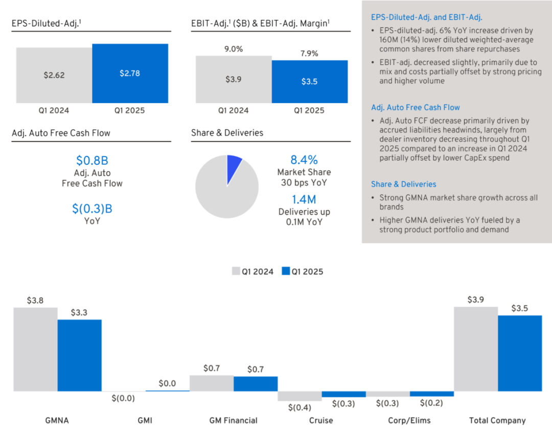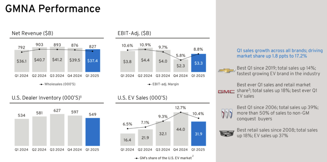 通用汽车2025年第一季度实现了稳健的财务结果:总营收达437亿美元,同比增长8%,优于市场预期,EBIT调整后为35亿美元。