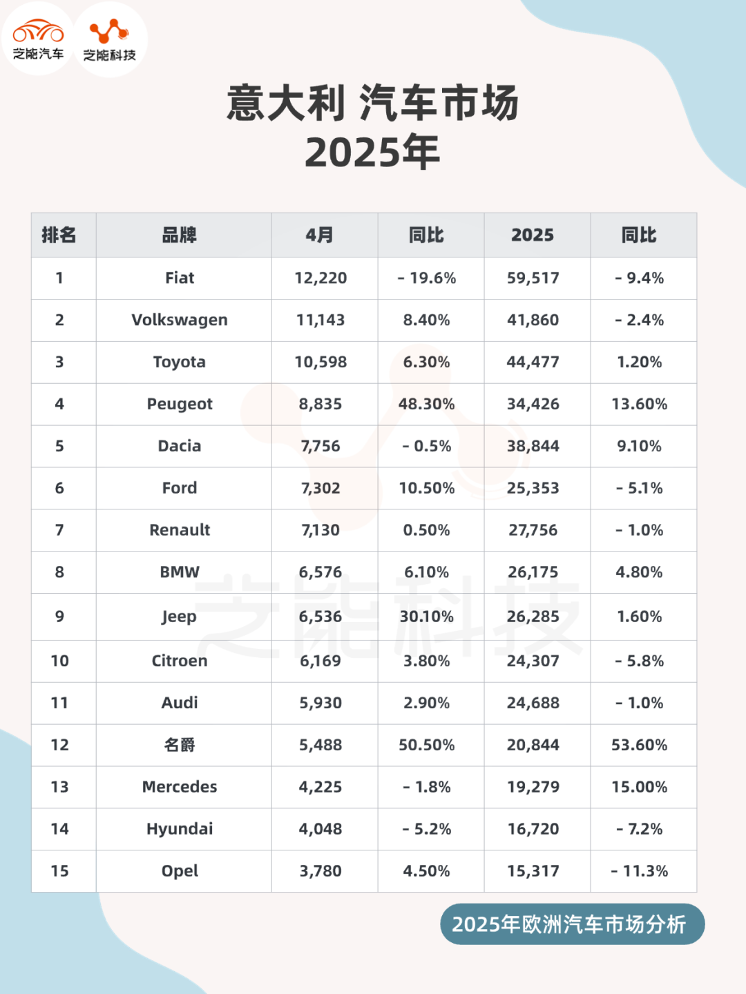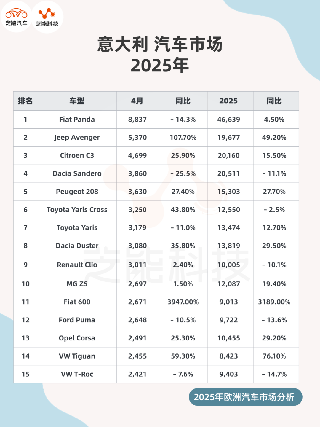 欧洲车市 | 意大利2025年4月:主流品牌竞争激烈,中国车企异军突起
