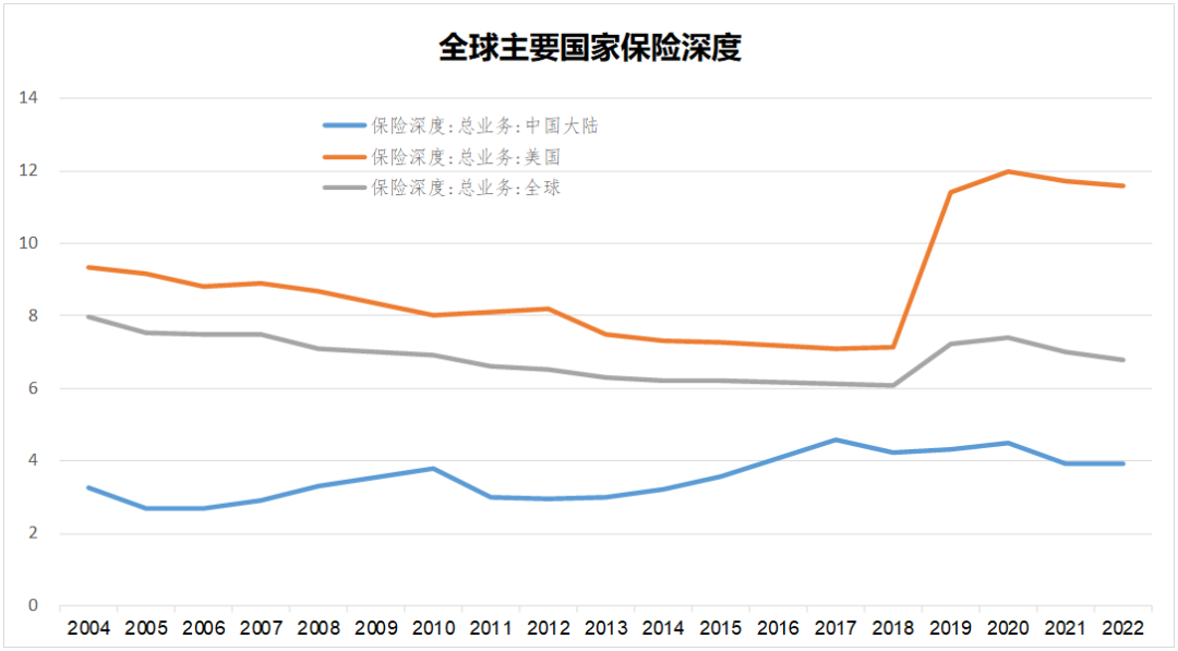 保险行业有个指标,叫做保险深度,是保费收入与GDP的比值。中国这个比值最近比较稳定,在4%左右。全球水平是7%,美国甚至可以到10%以上。