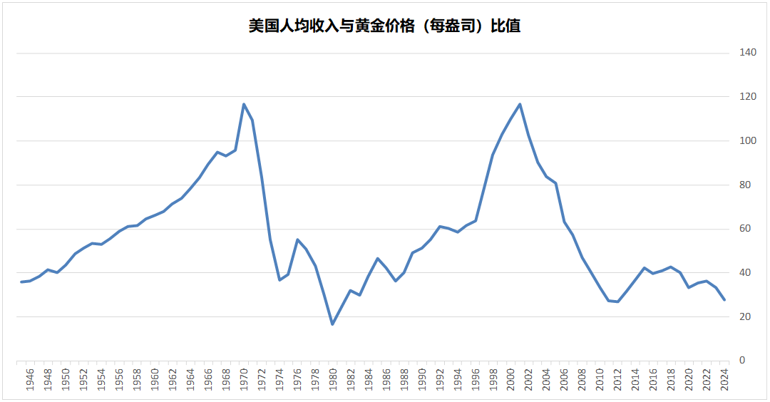 如果用美国经济分析局公布的人均收入数据去除以当年每盎司黄金的价格,就得出上面这张图。