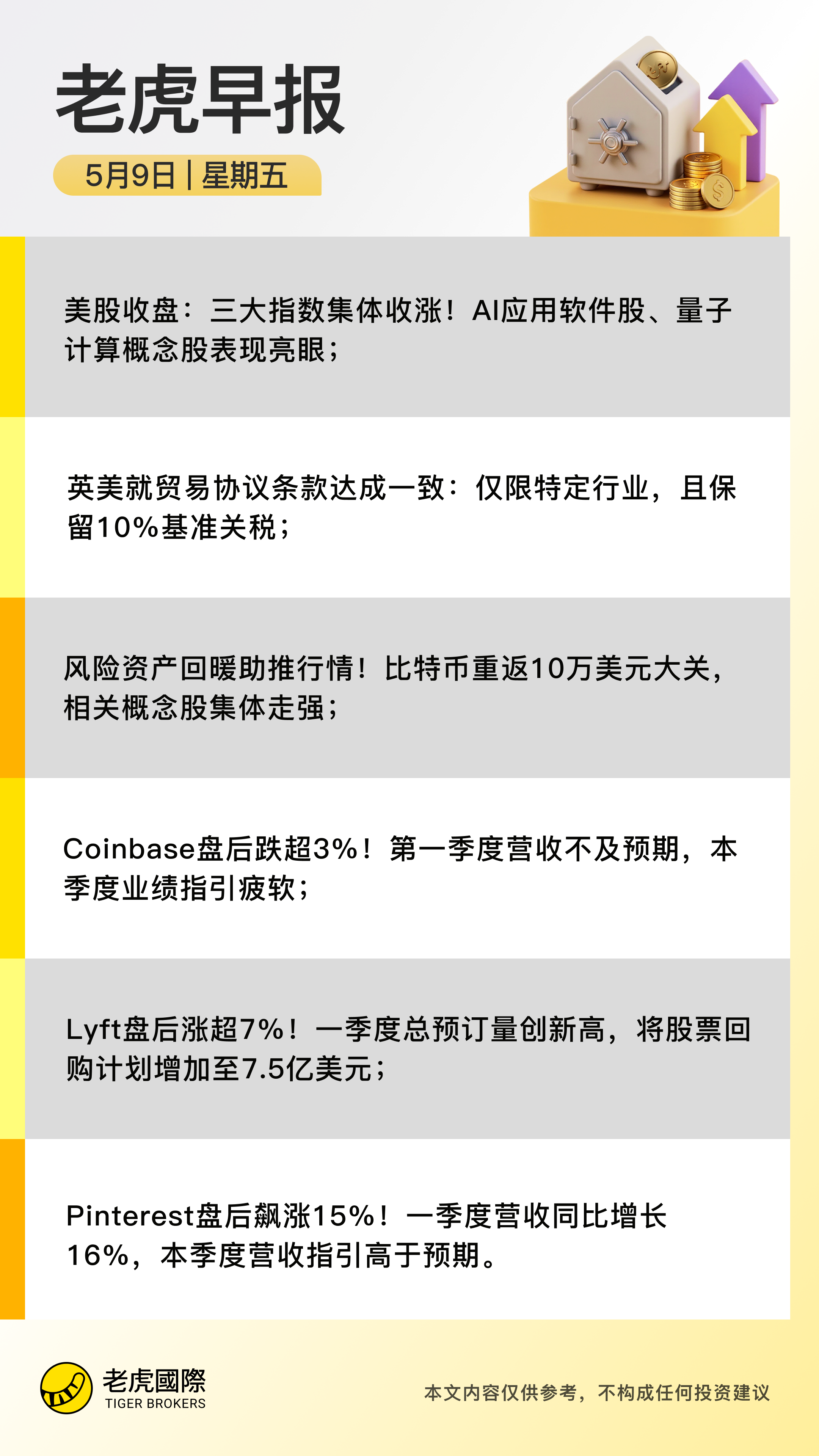 🔥【5月9日】三大指数集体收涨!比特币重返10万美元,你吃到肉了吗?