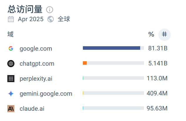 当然,我并不是说谷歌可以高枕无忧。不可否认,AI搜索已经对谷歌构成了竞争威胁。根据similarweb的数据,2025年4月,谷歌搜索的总访问量为810亿,Gemini总访问量为4亿,而chatGPT 为51亿,相当于谷歌传统搜索的6%,是Gemini的10倍。加上perplexity 、claude 、Grok,AI搜索应该分流了约5-10%的搜索流量。