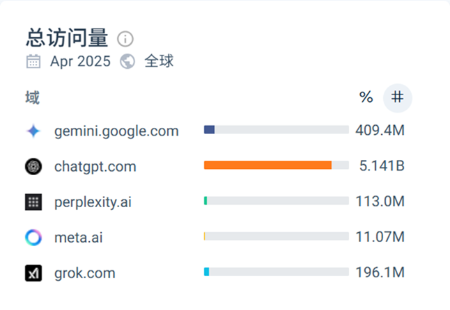 如果从访问量来看,根据similarweb的数据,2025年4月,Gemini的访问量为4亿,仅次于ChatGPT的50亿次,高于Perplexity、Grok的1亿多次和Meta AI的1000多万次。