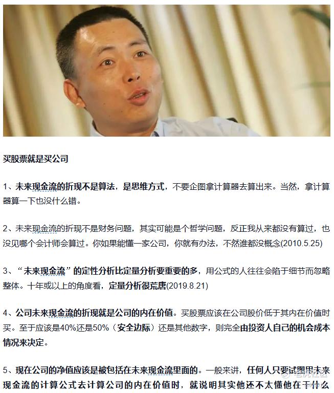 用段老大的话总结一下,买股票就是买公司,买公司就是买其未来现金流折现。这里现金流指的是净现金流,未来指的是公司的整个生命周期,不是3年,也不是5年。