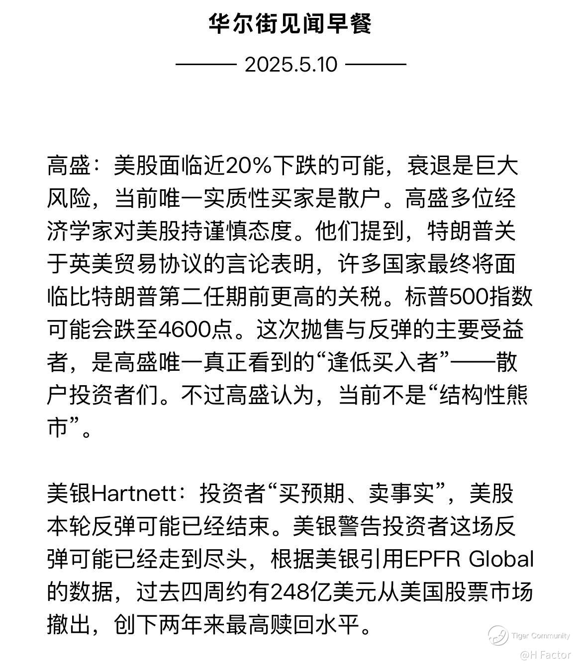 我最早是4.15 向会员发出第一次警醒,告诉大家我家办投研团队的 house view is “quite bearish”(见截屏),本周GS、JPM 、美银各大投行开始密集爆出衰退担忧——通常各大投行形成house view 后,先内部传达,然后通知高净值客户,然后对外发布——这个“过去四周248亿美元撤出美股”,和我家办最早警报我的时间前后一致,可能这四周就是给高净撤退的时间。因为248亿其实也不多。机构们估计这四周是最后扫尾撤退了。