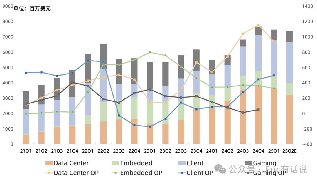 预计2025年Q2营收74亿美元,同比增长27%,环比下滑1%;预计Q2数据中心环比下滑,但数据中心CPU环比增长,客户端与游戏业务环比两位数增长,嵌入式业务环比持平;