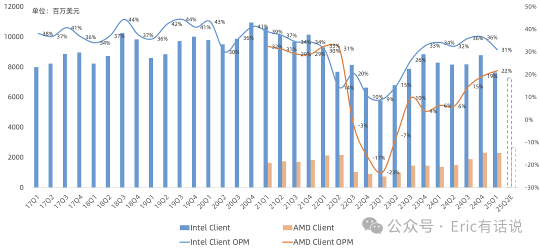 客户端营收22.94亿美元,同比增长68%,营收占比31%;游戏营收6.74亿美元,同比下滑27%,连续10个季度下滑,营收占比9%;与游戏合计经营利润4.96亿美元,游戏大概率经营亏损,客户端经营利润率约22%,不过仍低于Intel的31%;
