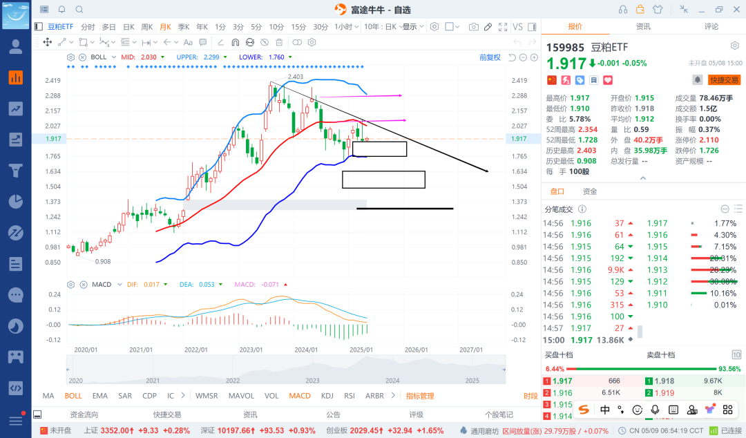 结合基本面和技术面来看,豆粕etf目前位置也还看,敢跌就继续买入就是,需要控制好头寸和节奏感了,不能买太多了,但中长期看买入是不会吃亏,就是需要等一段时间罢了。