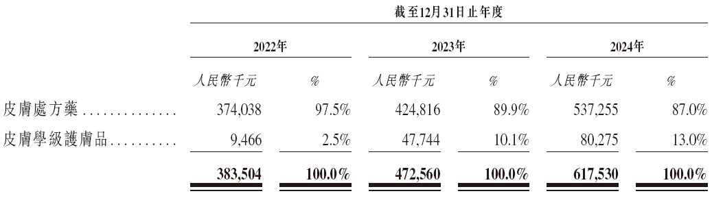 德镁医药的收入来自两条业务线,包括皮肤处方药的销售、皮肤学级护肤品的销售。