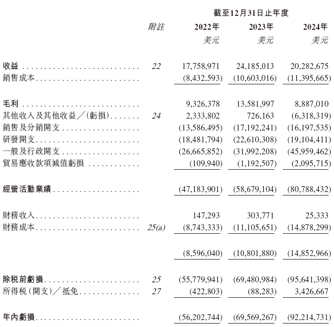 招股书显示,在过去的2022年、2023年和2024年,觅瑞的营业收入分别为1775.90万、2418.50万和2028.27万美元,相应的研发开分别为1848.18万、2261.03万和1910.44万美元,相应的净亏损分别为5620.27万、6956.93万和9221.47万美元。