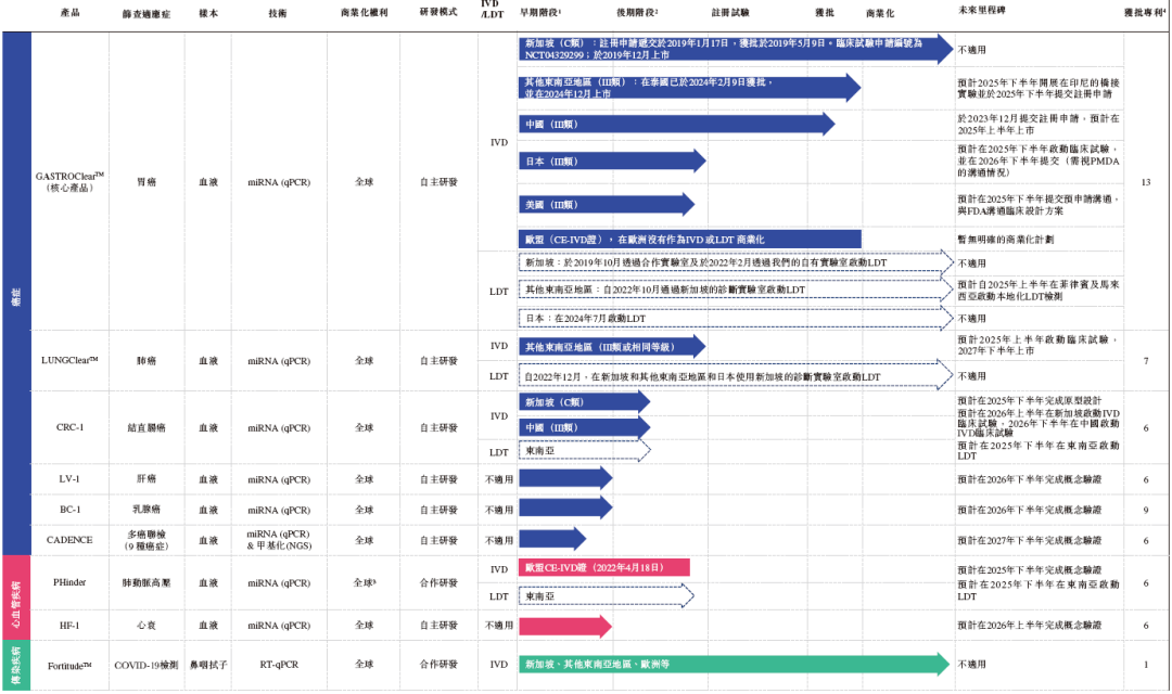 其他早前检测候选产品包括用于肺癌筛查及早期检测的LungClear™、用于结直肠癌早期检测的CRC-1、多癌检测试剂盒CADENCE、与Actelion Pharmaceuticals合作开发的用于肺高压早期检测的基于miRNA的检测试剂盒PHinder等。