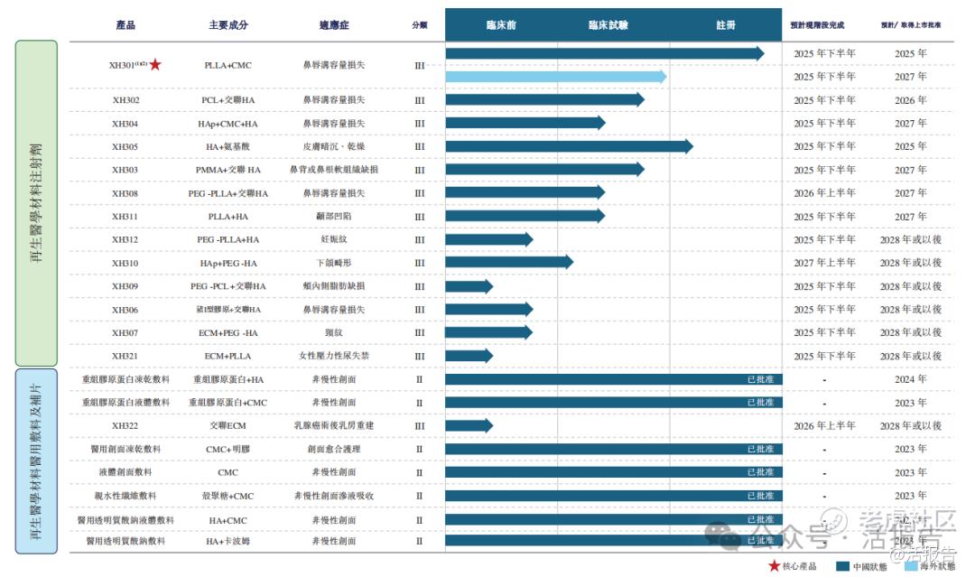 截至最后实际可行日期,公司拥有13款主要再生医学材料注射剂候选产品(均属第三类医疗器械),包括核心产品XH301及用于治疗女性压力性尿失禁的候选产品XH321,相关13款候选产品中的两款候选产品已进入注册审评阶段。