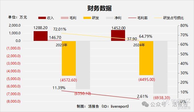 公司是主要从事再生医学医疗器械及特医食品研发、生产及商业化的医疗健康企业。2024年收入为 1452万元(同比增长12.72%),净亏损为 6938.3万元,研发开支占比64.79%。