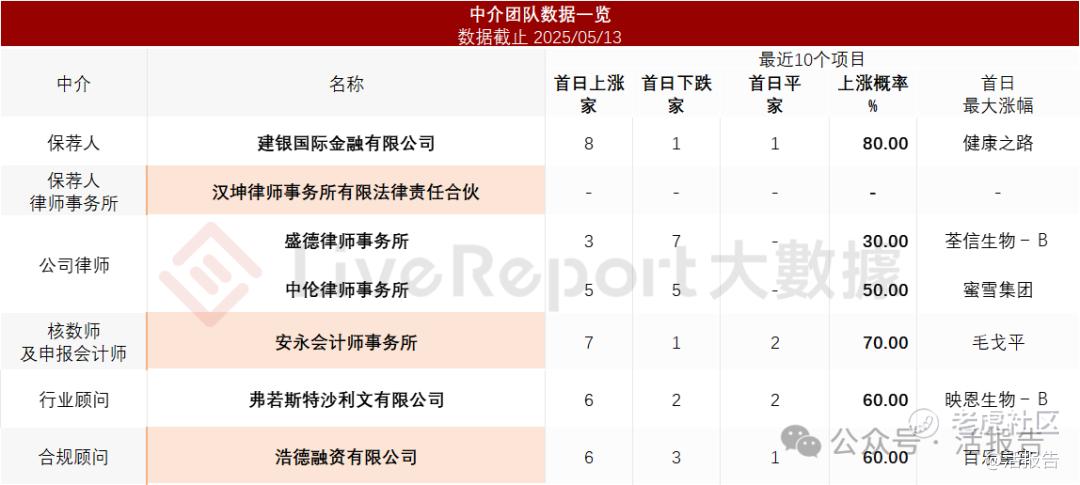 据LiveReport大数据统计,东方妍美中介团队共计7家,其中保荐人1家,近10家保荐项目数据表现不错;公司律师共计2家,综合项目数据不尽如意。整体而言中介团队历史数据表现一般。