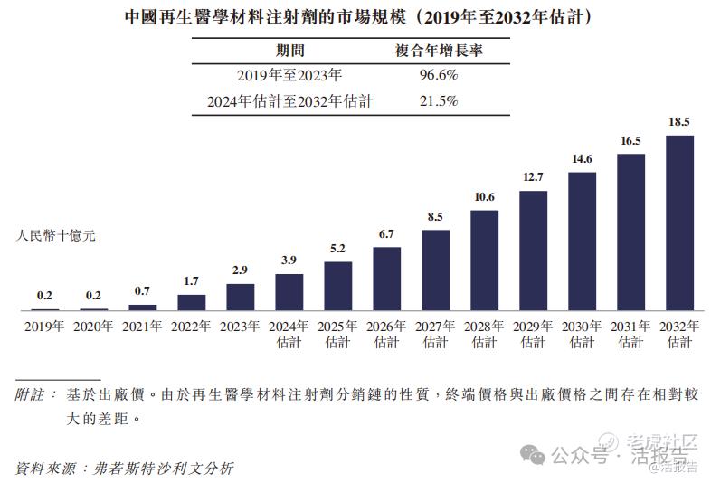 根据弗若斯特沙利文的资料,中国再生医学材料注射剂的市场规模由2019年的人民币2亿元扩大至2023年的人民币29亿元,该期间复合年增长率为96.6%。再生医学材料注射剂市场预计到2032年将产生人民币185亿元的收益,2024年至2032年的复合年增长率为21.5%。