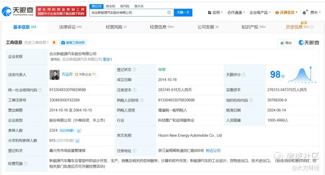 天眼查显示,哪吒汽车关联公司合众新能源汽车股份有限公司新增一则破产审查案件,申请人为上海禹形广告有限公司,经办法院为浙江省嘉兴市中级人民法院。