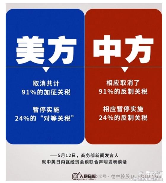 1. 5月12日,中美贸易战按下暂停键,双方取消了加征的91%的关税,暂停了24%的对等关税和反制关税,完全符合我5月1日的预判。这是中美互利共赢的开始,但并不意味着美国经济面临的问题得到了解决。