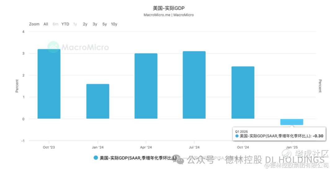 3. 美国财政赤字持续扩大,国债总额飙升,特朗普政府的财政承诺与现实背离, 2025年一季度在库存大幅增加的情况下GDP增速由正转负,财政可持续性面临严峻考验。