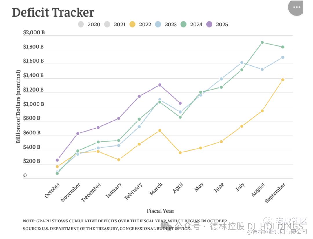 也就是说,特朗普政府上台后推行的政府裁员和关税战都未能缓解美国的债务压力。我在《降息势在必行》和《DOGE进行时——裁员的闭环逻辑》中明确地讲过,美国政府每年可以自由支配的预算总额都不到2万亿美元。削减支出很难,只有降息才可行。