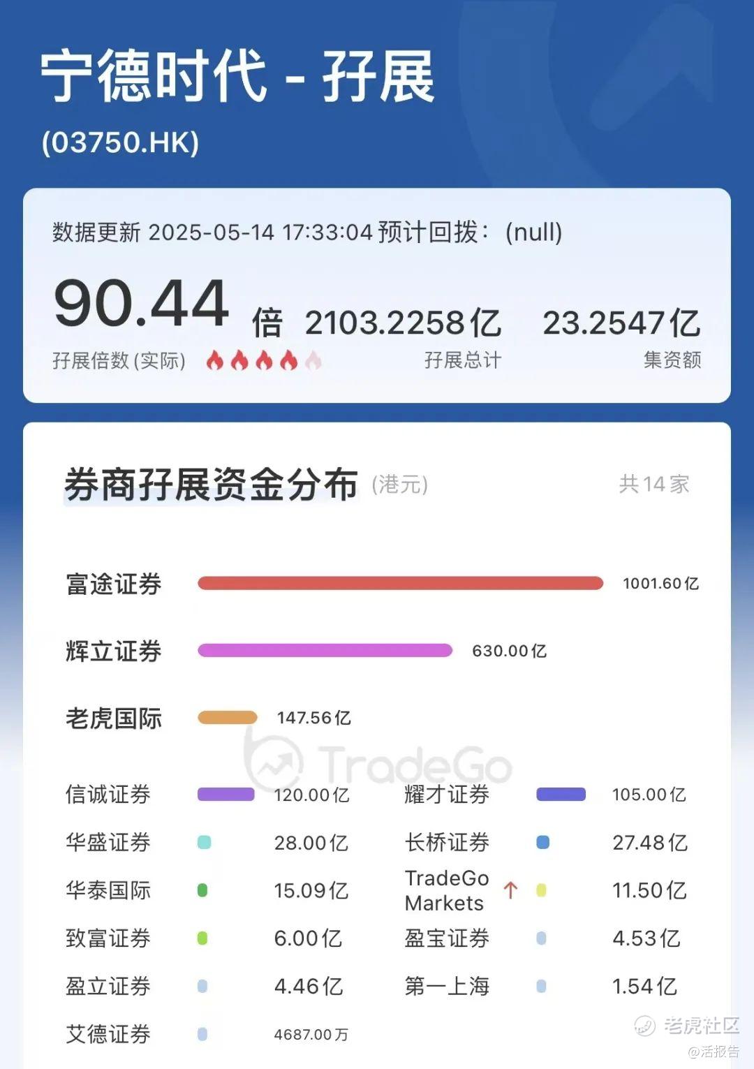 捷利交易宝孖展数据显示,截至5月14日17:33,公开部分孖展认购倍数达90.44倍,认购金额超2103亿港元,其中富途证券放出超千亿孖展,辉立证券放出630亿,老虎国际放出148亿港元(证监会要求,现时各券商最高只能提供10倍孖展)。
