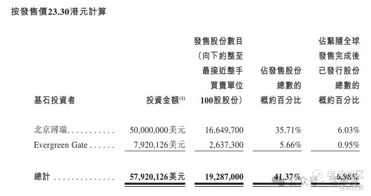 若不回拨的情况下,按23.3港元计,国配部分约占9.78亿港元,其中有2家基石投资者北京浔瑞、Evergreen Gate参与,认购总金额达4.49亿港元,约占全球发售股份的41.37%。