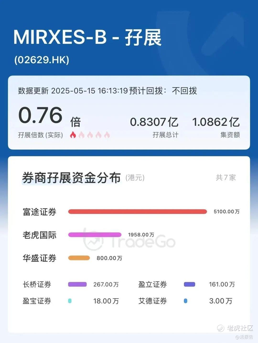 据捷利交易宝的新股孖展数据,截至5月15日港市收盘,MIRXES-B首日的孖展总额约8307万港元,孖展认购倍数约0.76倍,首日认购未足额。其中,富途证券、老虎国际、华盛证券分别放出5100万、1958万、267万港元。