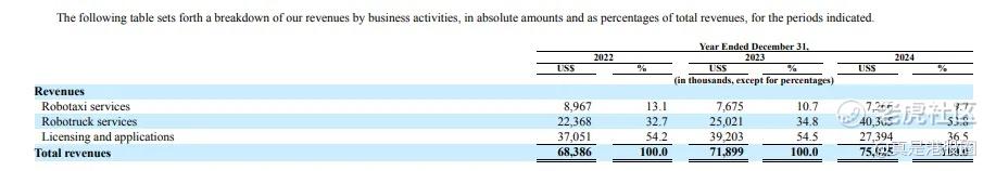 看到小马智行去年底的业绩,robotaxi业务及授权收入甚至下跌,只是靠无人卡车业务带动2024年维持增长,而无人卡车毛利率更低,因此把公司整体毛利率带下去了。