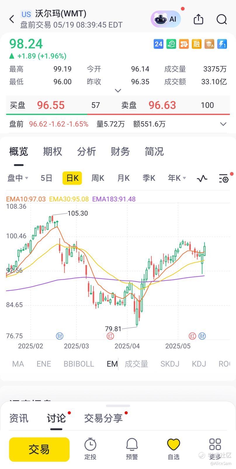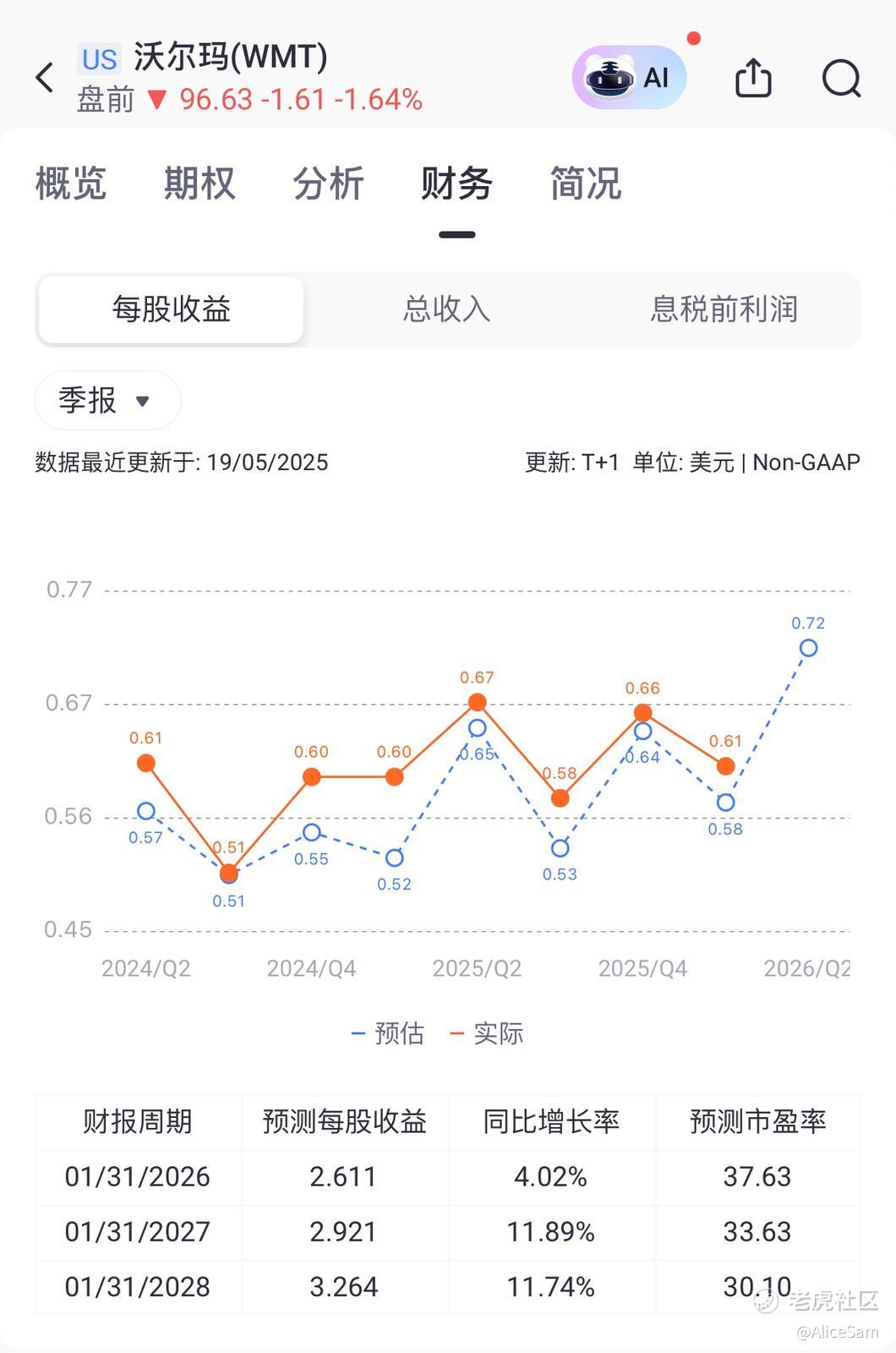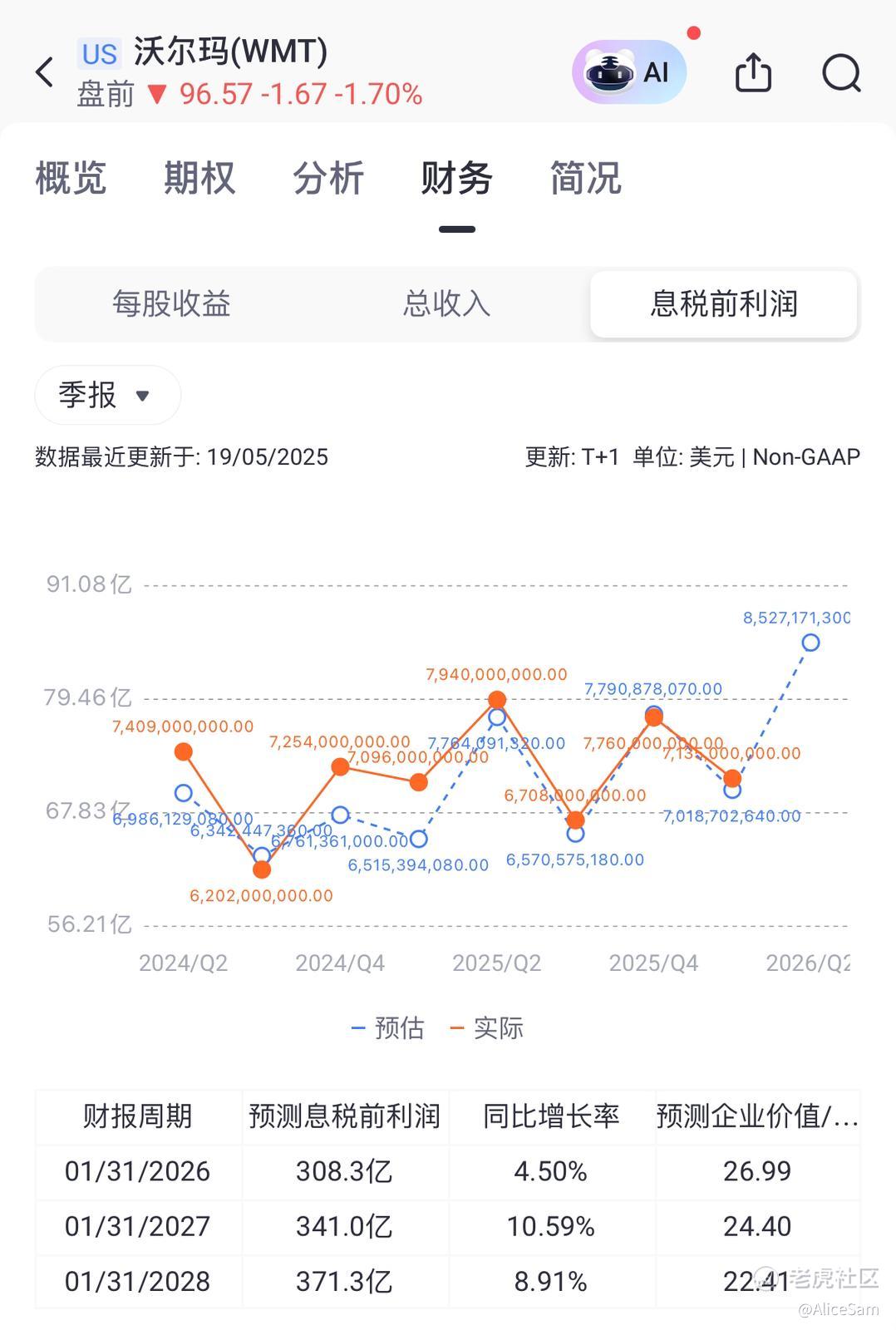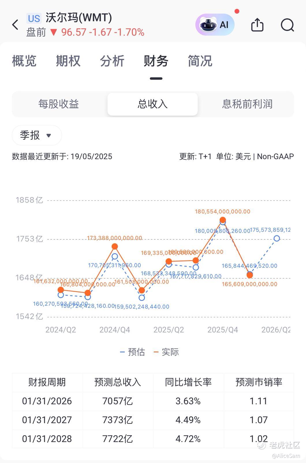 综合看下来,沃尔玛在2026财年第一季度展现了相对稳健的财务表现,收入和经营利润均实现增长。电商业务和广告业务的强劲表现成为亮点。他们通过战略投资和运营效率提升,为长期增长奠定了基础。尽管面临全球经济不确定性和市场竞争等挑战,沃尔玛凭借其强大的品牌影响力、广泛的业务布局和持续的创新努力,有望在2026财年实现其全年业绩目标, 但是由于美国关税政策的变动,他们拒绝对当前财季提供每股盈利或营运盈利的增长预测。 这是被总统先生搞怕了吗。[贱笑]