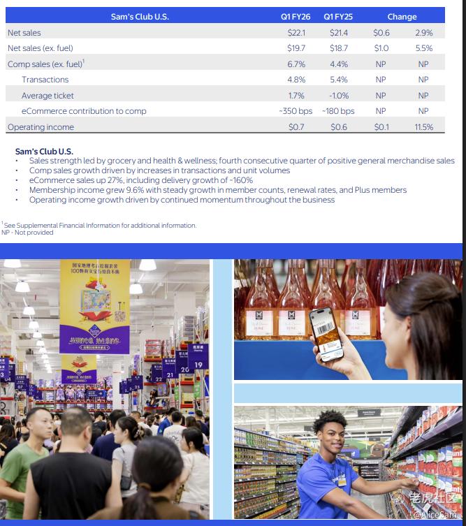 还有就是经营利润表现不俗,这个季度沃尔玛的经营利润增长4.3%,达到71.35亿美元。调整后的经营利润增长3.0%(按固定汇率计算)。这一增长主要得益于更高的毛利率和会员收入增长,以及电商业务的经济效益改善。
