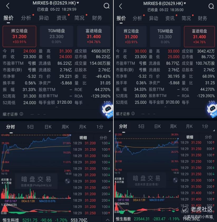 MIRXES-B(02629.HK)辉立暗盘以最低点24.00港元高开,立马上冲到29.50港元后,再震荡上行,最高涨到31.30港元,尾盘以次高点31.20港元报收,涨幅为33.91%,振幅31.33%,成交4500万港元。