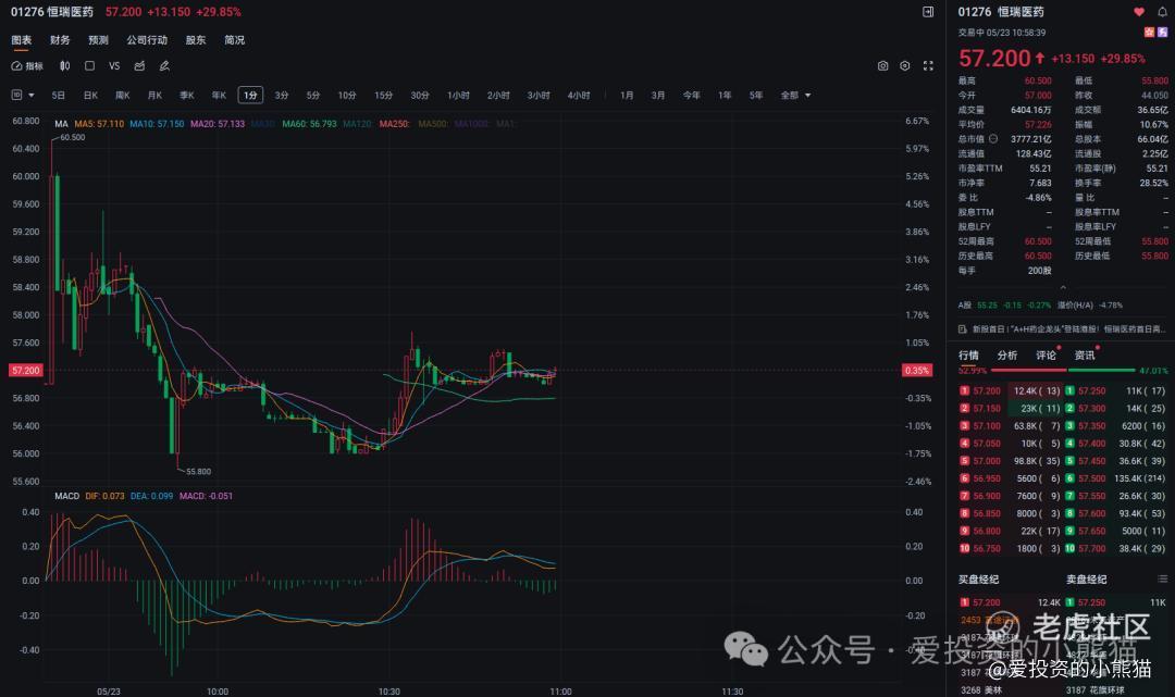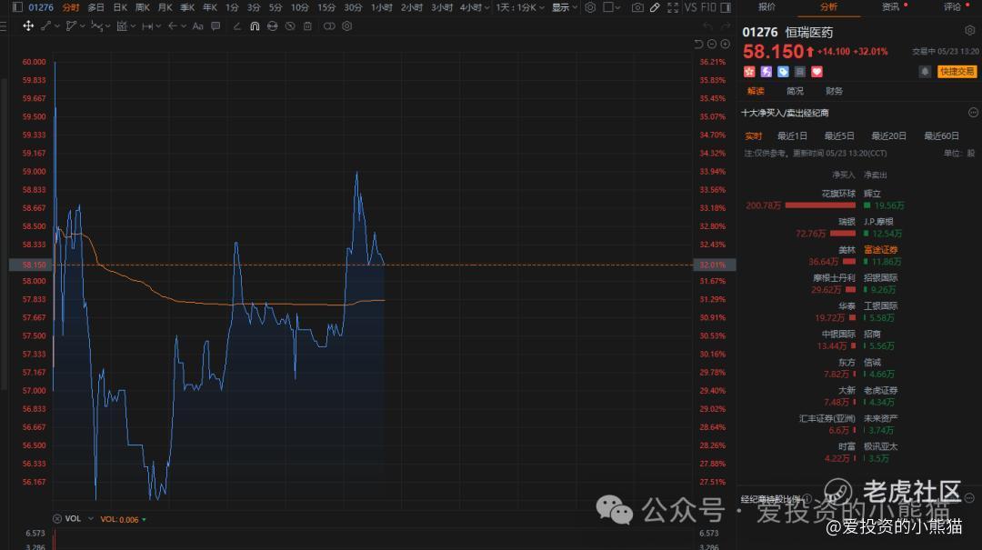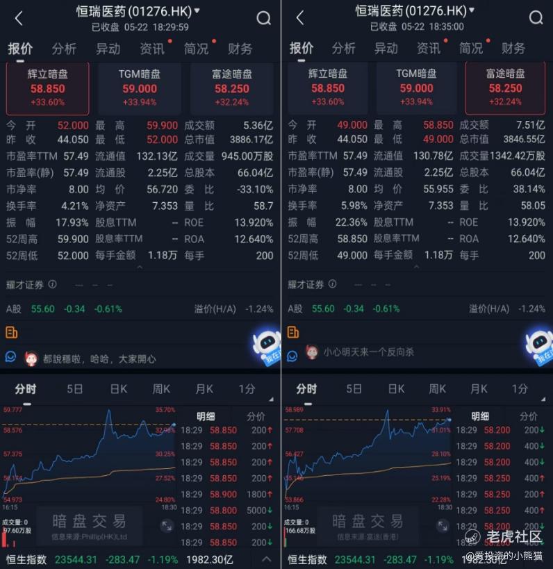 恒瑞医药 (01276.HK) 辉立暗盘以最低点52.00港元高开,一路稳步上升,最高冲到59.90港元,再回落震荡,尾盘以58.85港元报收,涨幅为33.60%,振幅17.93%,成交5.36亿港元。