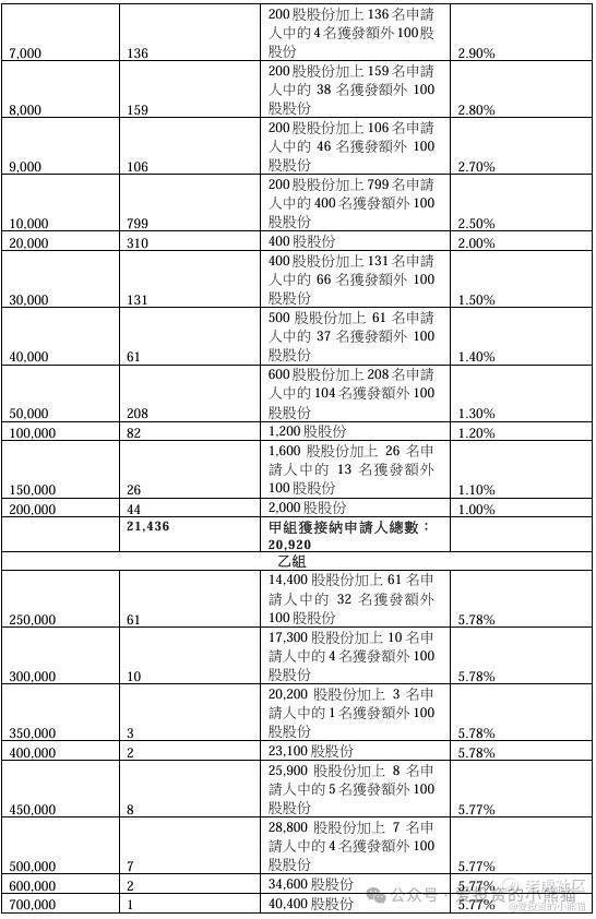 MIRXES-B(02629.HK)乙组官方披露的中签名单里有29人中签14400股,有32人中签14500股,有6人中签17300股,有4人中签17400股,有2人中签20200股,有1人中签20300股,有2人中签23100股,有3人中签25900股,有5人中签26000股,有3人中签28800股,有4人中签28900股,有2人中签34600股,有1人中签40400股,有2人中签57700股,有1人中签86600股,有1人中签115400股,有5人顶头槌认购中签134000股,有2人顶头槌认购中签134100股。乙组总共中签293.68 万股,货值约6843万港元。