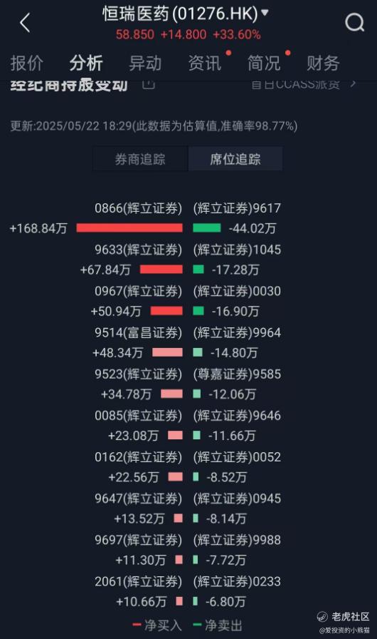 恒瑞医药是0866,9633,0085,0162,9623btig,0085,这些是经常出现的机构,然后还有0967,9514,9523,9647,9697这些,甚至连散户的2061的席位都在买,散户席位9988卖的。