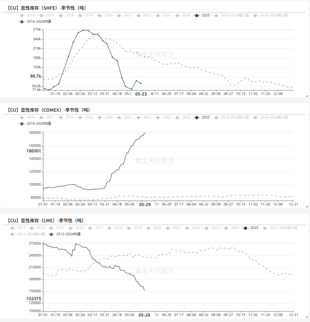 我们现在就处在一个SHFE和LME的库存整体偏低,而Comex库存偏高的事情,这个事情可以从宏观去思考,也可以不从宏观去思考,从我自己角度来说,我相信铜是有一定囤积的需求的,无非美国刚刚开始做这个事情而已。