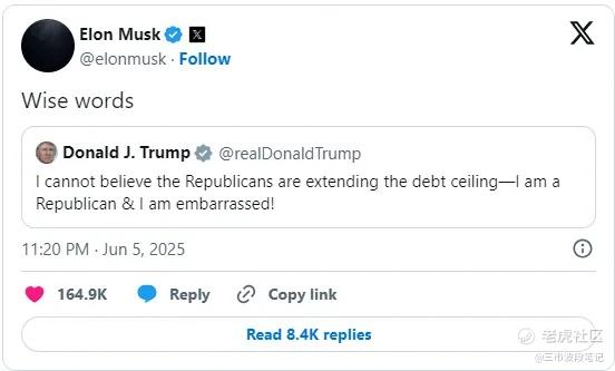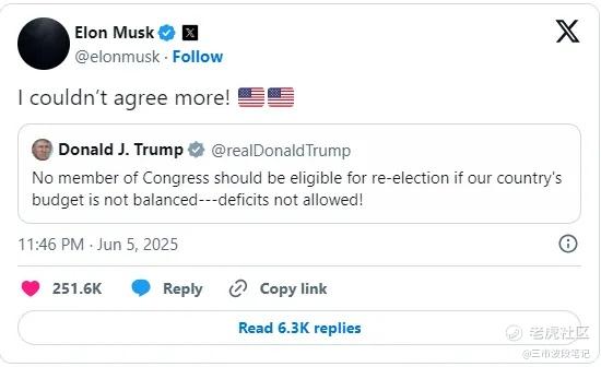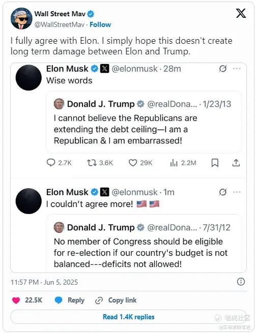 马斯克直接抨击了特朗普,转发了特朗普2013年批评共和党提高债务上限的一条推文。“说得真有道理,”马斯克说道。