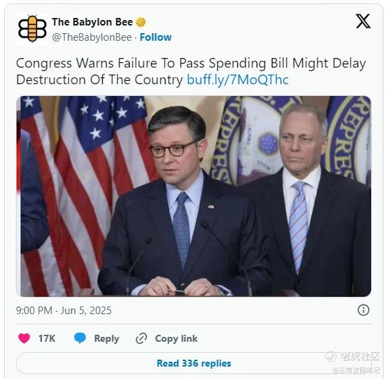 周四上午10:37,马斯克转发了基督教新闻讽刺网站“巴比伦蜜蜂”(The Babylon Bee)的帖子,开启了他的X活动。该网站刊登了一篇关于该法案的“报道”。标题是:国会警告:未能通过支出法案可能会延缓国家毁灭。