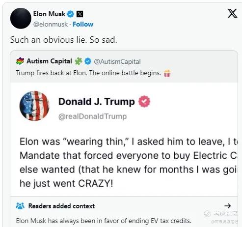 马斯克回应特朗普的帖子:“这明显是谎言。真可悲。”