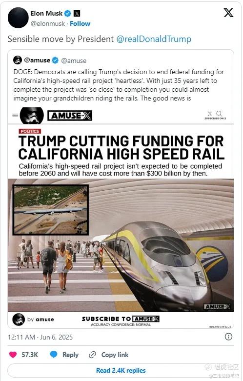 马斯克停止批评,转而赞扬总统削减加州高铁资金的决定,称这是明智之举。