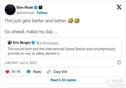 他随后转发了一条帖子,暗示终止政府合同将导致国际空间站解散,并配上了笑脸表情。“来吧,让我开心一下……”他说。