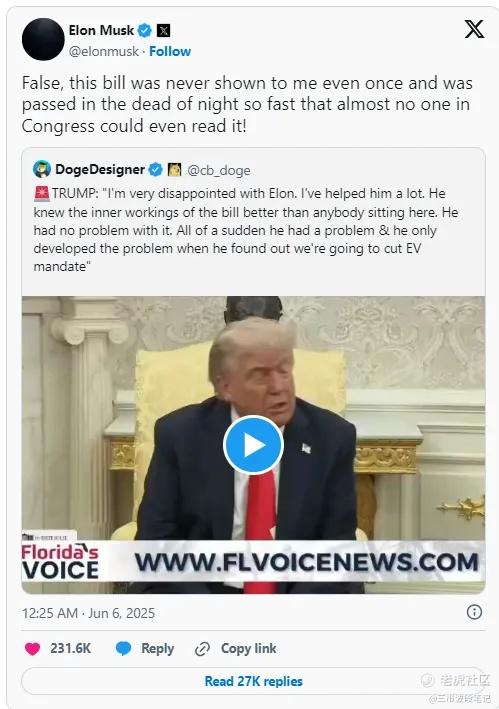 但八分钟后,马斯克似乎立即回应了特朗普关于电动汽车强制令的说法:“随便你。”这位特斯拉首席执行官表示,他同意将电动汽车补贴削减保留在法案中,但指出石油和天然气补贴并未受到影响(这“非常不公平!”)。他还批评了该法案中大量的“政治包袱”。