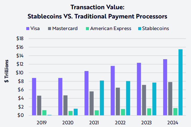 ARK Invest 今年2月发布的《Big Ideas 2025》报告显示,2024 年稳定币交易总额达 15.6 万亿美元,分别为Visa 和万事达交易额的 119% 和 200%。