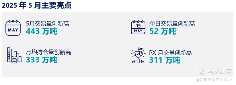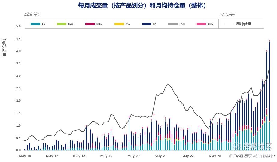 在经济不确定性和上游石油价格波动的背景下,2025年5月成交量和月均持仓量均创纪录,分别达311万吨和 206万吨。