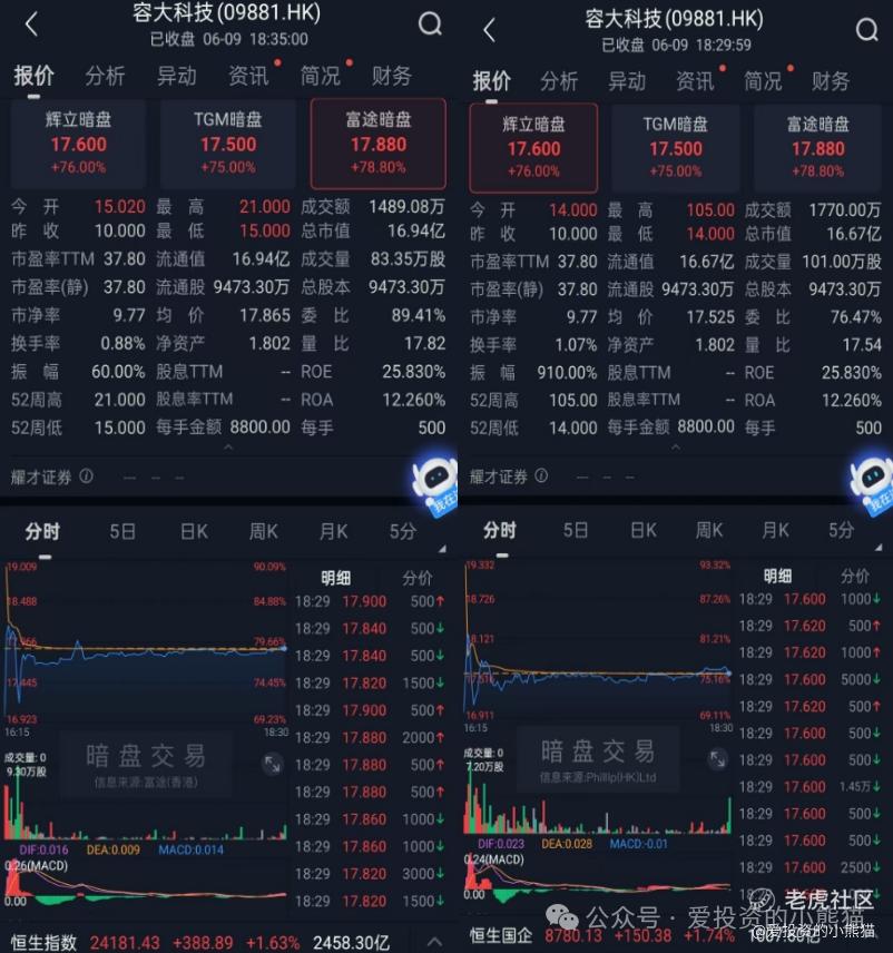 容大科技(09881.HK)辉立暗盘以最低点14.00港元高开,立马上冲到最高点105.00港元后,又瞬间大幅回落到17.00港元附近,再横盘震荡,尾盘以17.60港元报收,涨幅为76.00%,振幅910.00%,成交1770万港元。