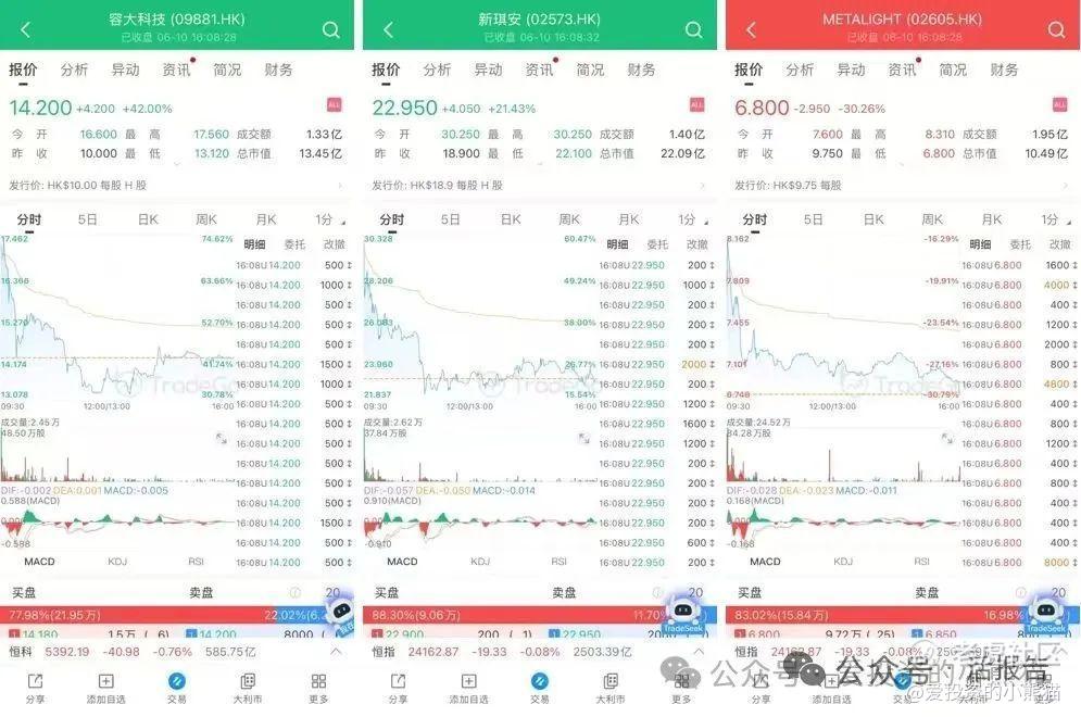 上市首日 $新琪安(02573)$ 高开60.05%,之后震荡回落,尾收盘收22.95港元,涨21.43%; $容大科技(09881)$ 高开66.00%,后来也是震荡回落,尾盘收14.20港元,涨42.00%;另一个 $METALIGHT(02605)$ 低开-22.05%,上冲到8.13港元后继续下跌,尾盘收6.80港元,跌30.26%。