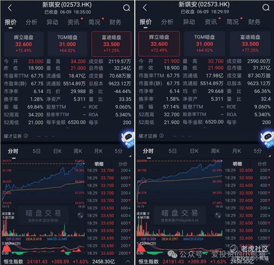 新琪安(02573.HK)辉立暗盘以最低点21.90港元高开,一路稳步上升,最高冲到32.70港元,尾盘略有回落以32.60港元报收,涨幅为72.49%,振幅57.14%,成交2590万港元。